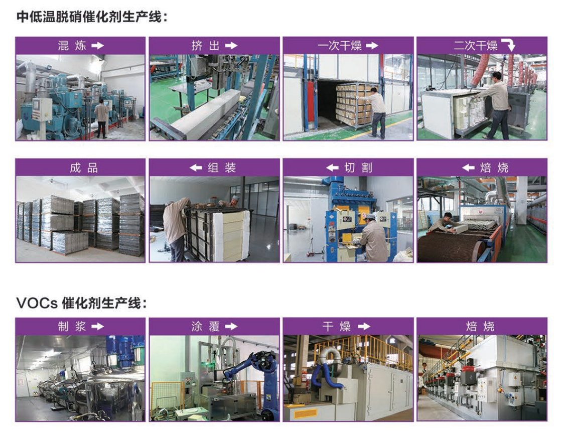 生产基地坐落于盐城环保科技城,建有中低温SCR脱硝催化剂生产线、VOCs治理催化剂生产线、催化剂全尺寸评价系统,占地面积约18000m2。基地年产中低温脱硝催化剂6000m3,VOCs治理催化剂500m3,己在钢铁、焦化、水泥、玻璃、垃圾焚烧、化工、涂装、印刷等行业成功应用,产品整体性能卓越,脱硝效率高,运行稳定,得到用户一致好评。