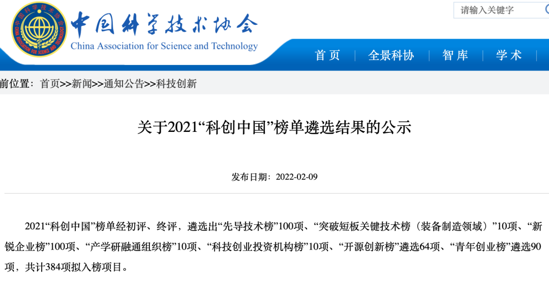 “科创中国”是中国科协2020年 打造的榜单品牌,旨在构建资源整合、供需对接的技术服务和交易平台,以发现企业需求价值和构建园区产业链为重点,通过探索产学融合的组织机制和激励机制,实现人才聚合、技术集成、服务聚力,推动技术交易规范化、市场化、国际化,建设创新、创业、创造生态,使科技更好地服务经济社会发展。2021年度先导性技术榜单,主要分生物医药、资源环境、电子信息、装备制造、 材料、现代农林等六大领域,由全国学会、各省市科协推荐,共选出100项先导性技术。此次发布的先导技术成果能够代表前沿水平,商业模式可见、商业潜力巨大,具有产业先导意义。中创清源入选的“新型中低温脱硝催化剂的开发与产业化”是“资源环境领域”的18项技术之一。