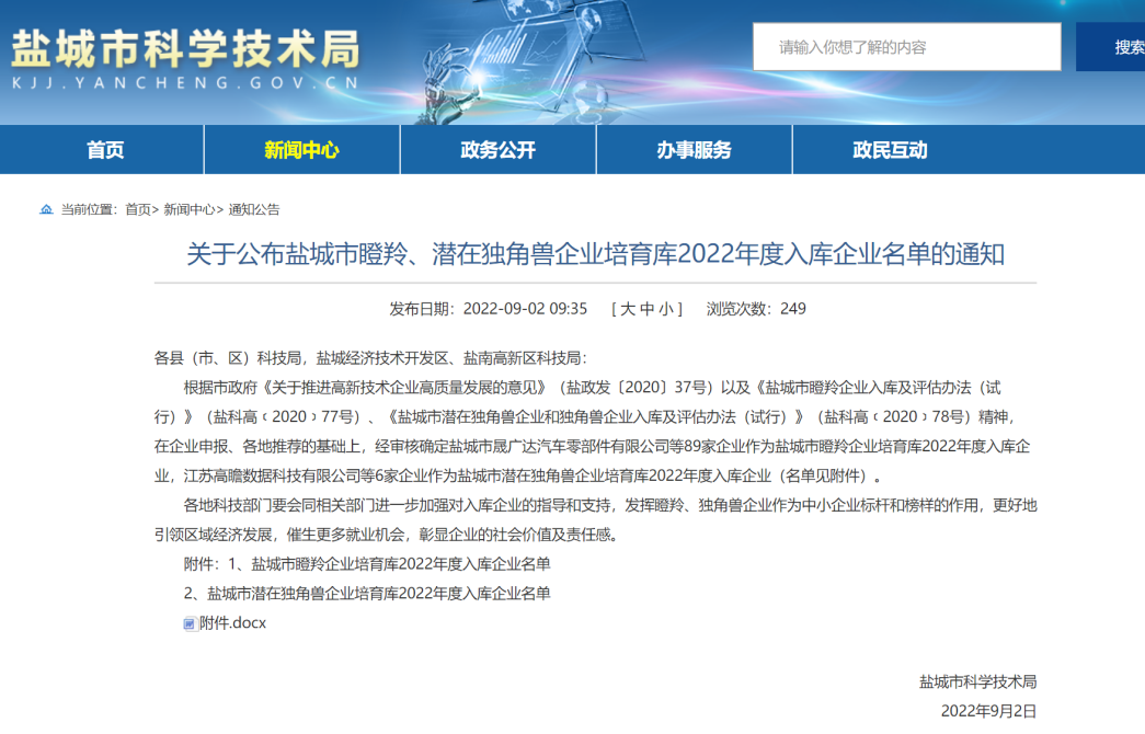 近日,盐城市科学技术局公布了盐城市瞪羚、潜在独角兽企业培育库2022年度入库企业名单。其中,中创清源等89家企业被选为盐城市瞪羚企业培育库2022年度入库企业。